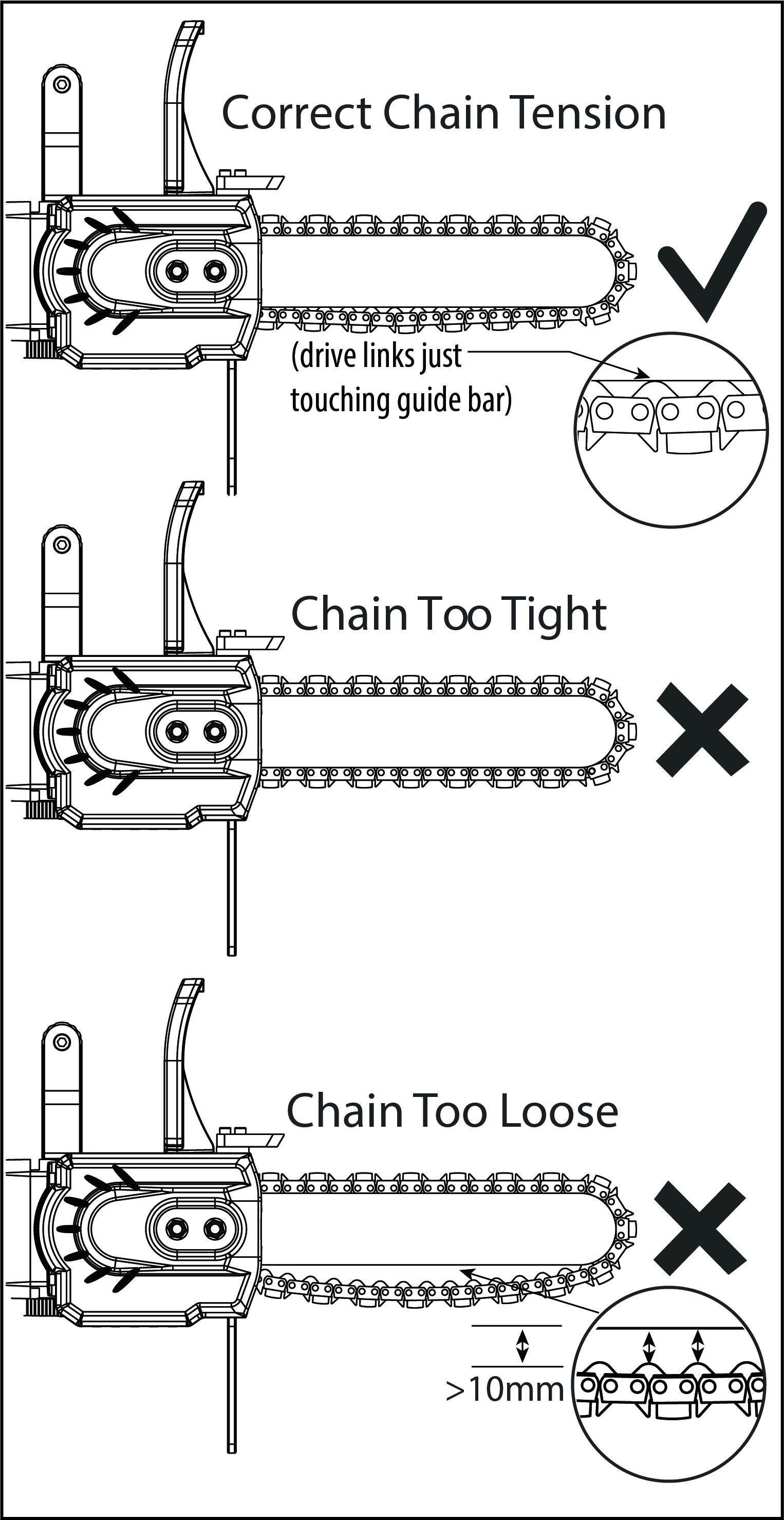 • Stop to adjust the chain tension whenever it hangs down more than about 10mm from the center of the guide bar. An overly loose chain can jump teeth on the drive sprocket, leading to rapid wear.