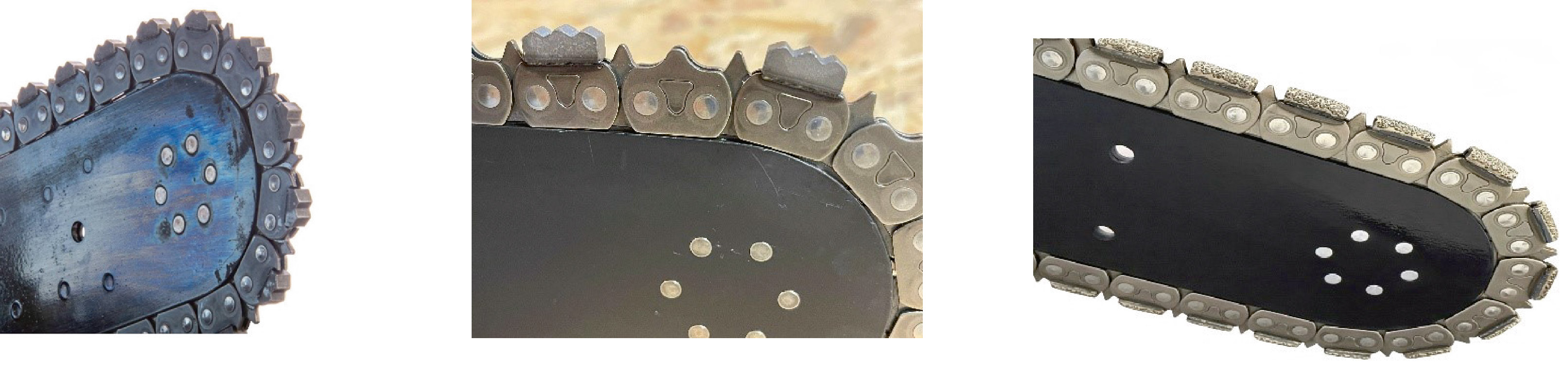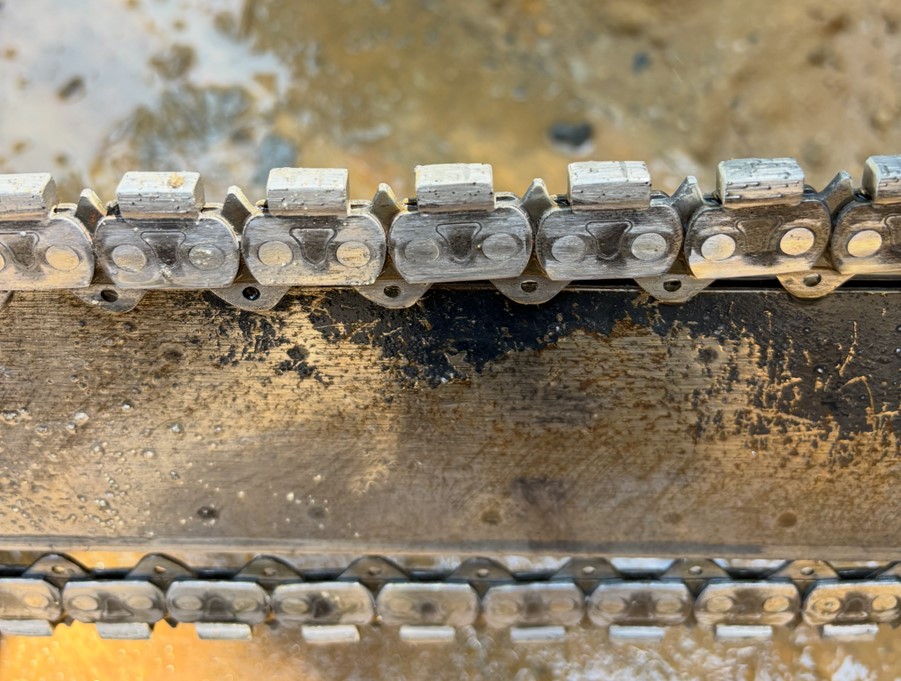 Running a new chain on a consumed bar or sprocket will cause damage to the chain drive links & side plates, causing premature chain wear and potential failure while cutting material. A new chain has smooth triangular shape drive links. A consumed chain will have the drive links turn thinner with visible consumption of the side plates.