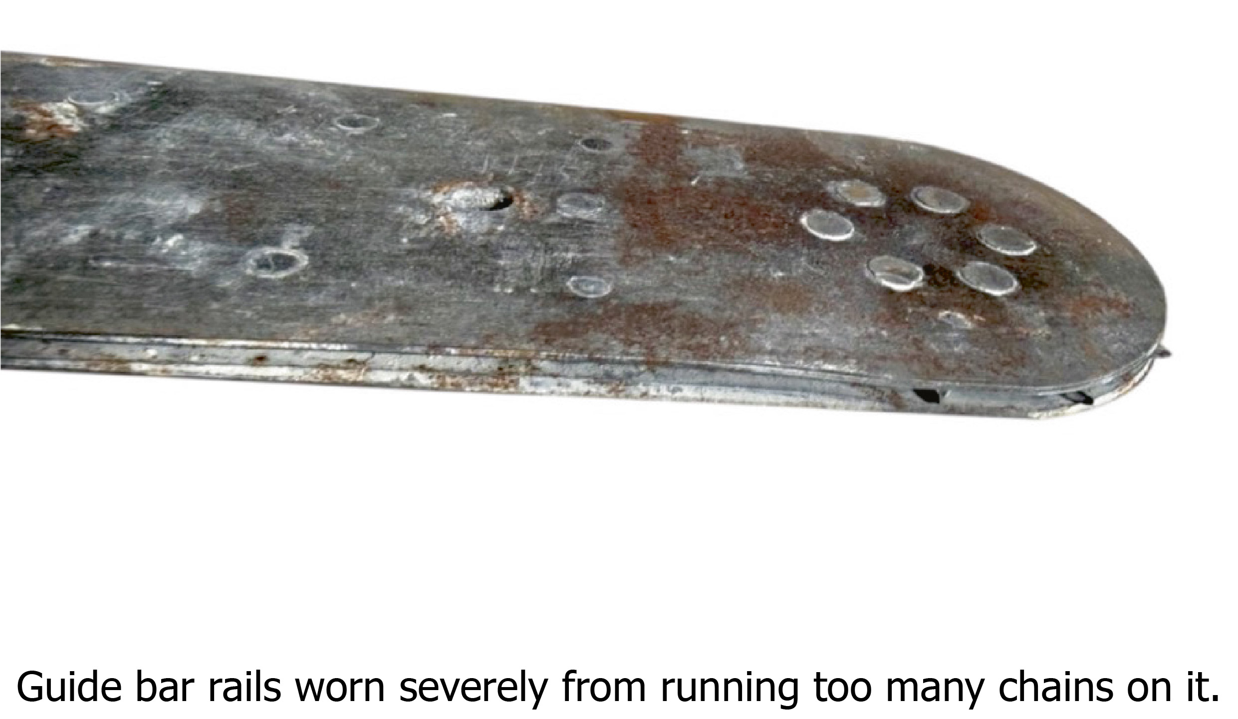 A bar that is over consumed will cause bearing failure in the nose sprocket, allowing the bar to split open at the nose, or the nose sprocket bearing to lock. Checking the guide bar nose sprocket is critical after 2 chains, plus if cutting abrasive materials such as brick / block / asphalt, this will aggravate the consumption.