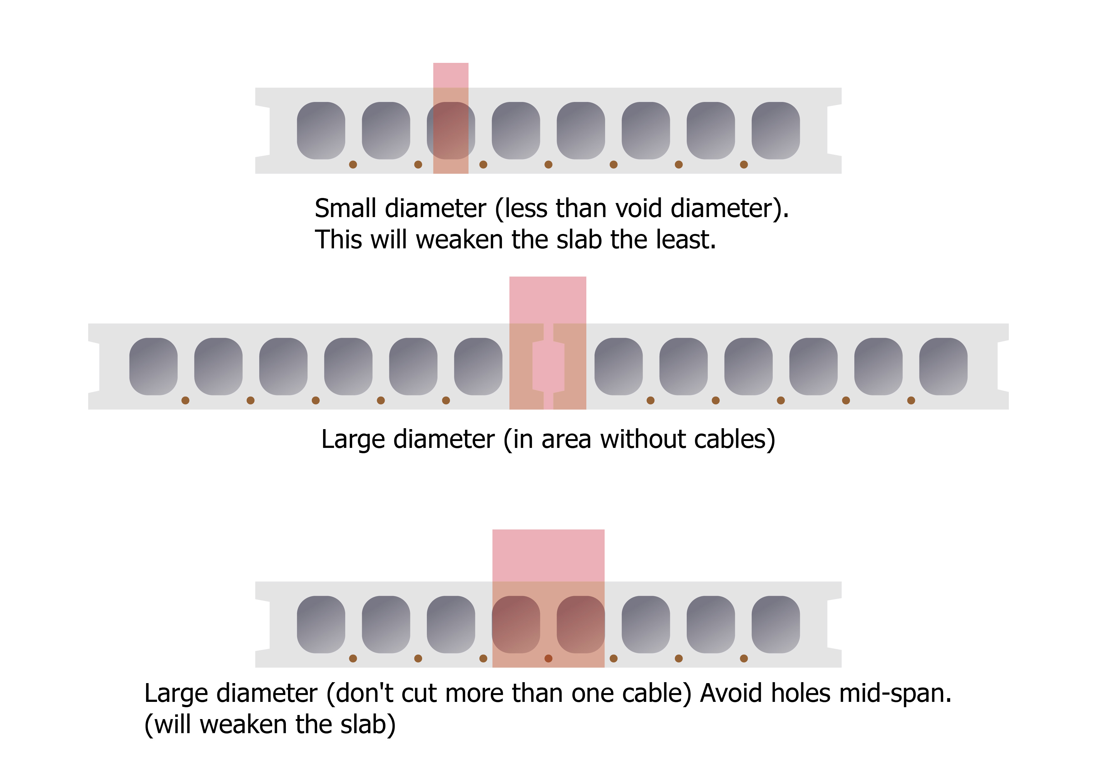 If it’s necessary to drill a hole larger than the diameter of the voids, try to find a section where there are no cables, such as at the lengthwise keyways between slabs.