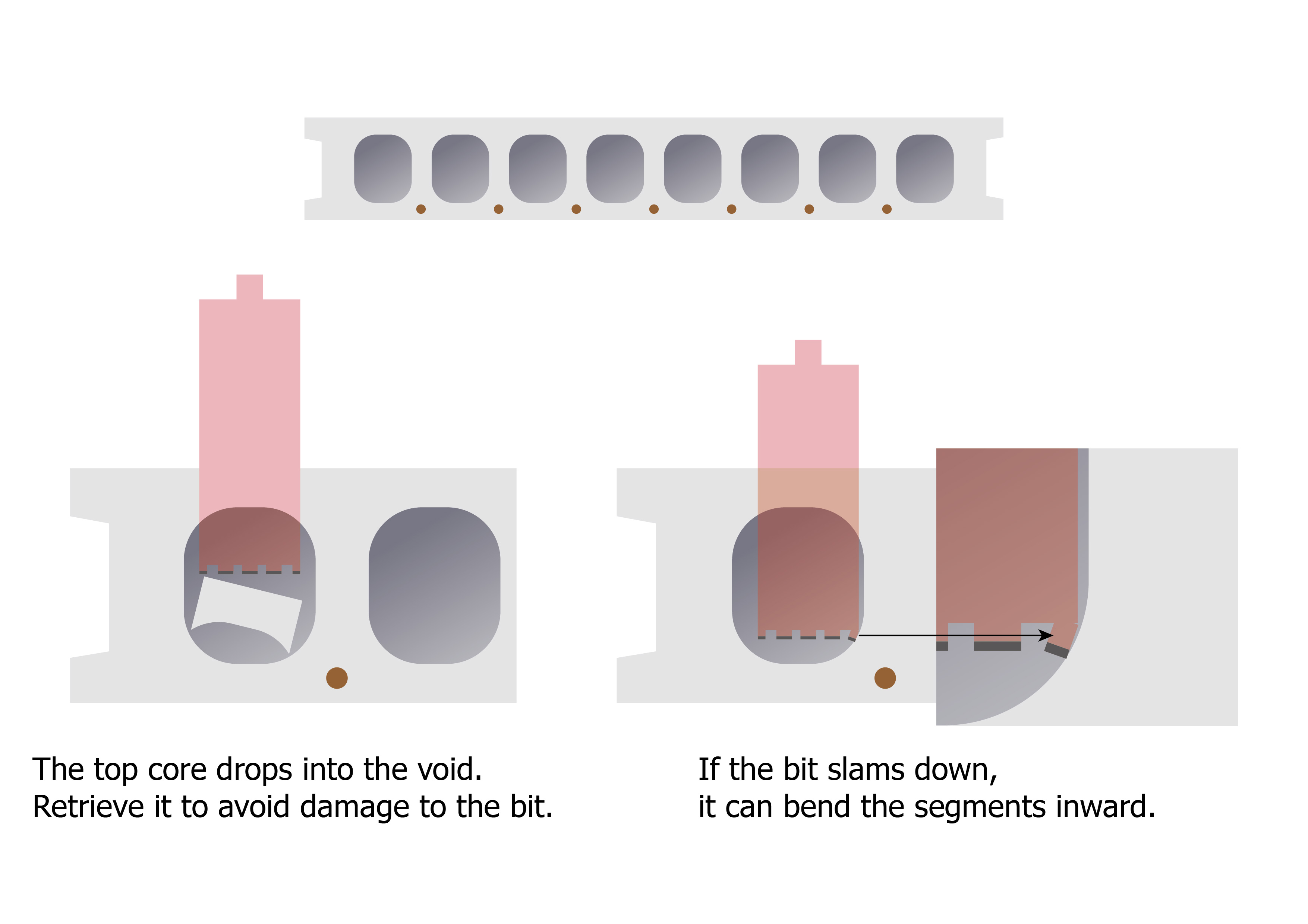When the top half of the hole breaks through and the core drops into the void, there is a risk that this core could damage the core bit’s teeth.
